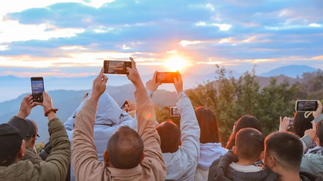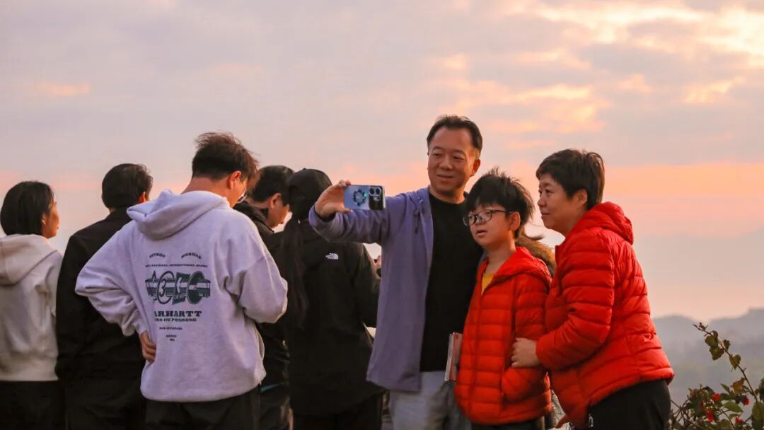 游客在景迈山巅拍摄日出云海、合影留念。