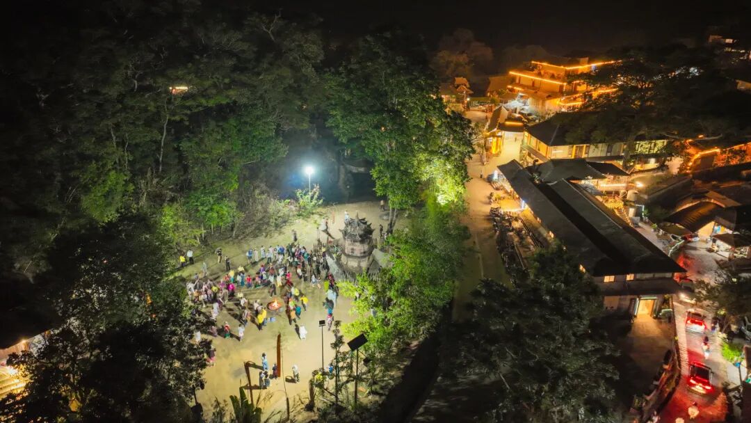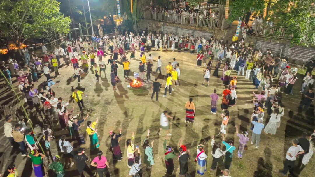 夜色中,村民与游客围绕篝火跳起民族舞,夜色下的景迈山洋溢着热烈而温暖的节日氛围。